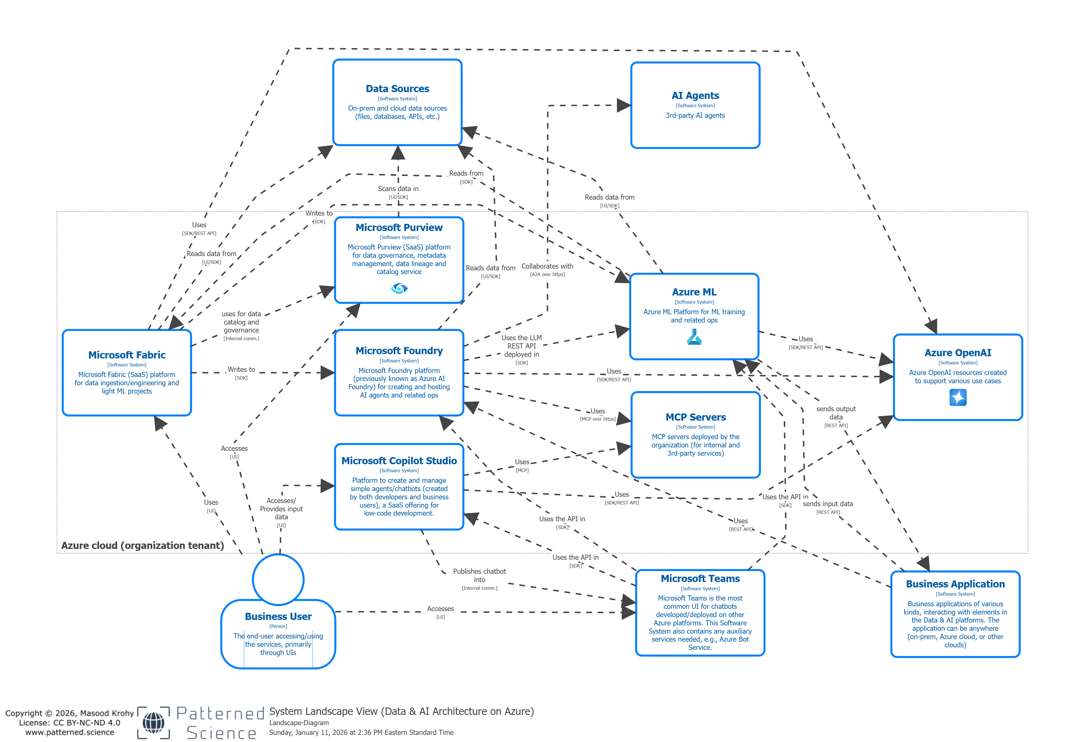 Designing a proper platform architecture strategy on the Azure cloud is not trivial, considering the large number of platform options available. In this set of diagrams for Data & AI Architecture on Azure, I’m depicting the main options available and how they potentially could interact with each other in the context of a solution architecture. The C4 methodology is used to do the modeling with architecture-as-code, with 10 views produced.